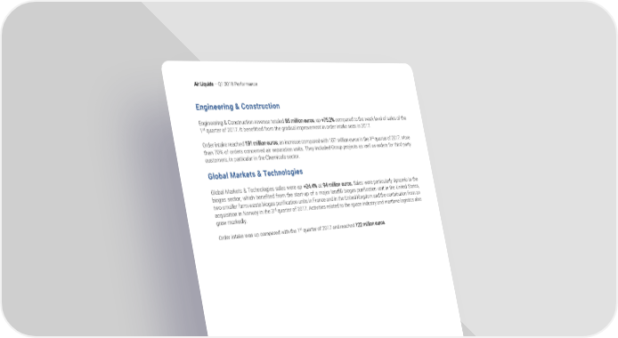 Air Liquide – Q1 2018 Performance Engineering & Construction Engineering & Construction revenue totaled 85 million euros, up +75.2% compared to the weak level of sales of the 1st quarter of 2017. It benefitted from the gradual improvement in order intake seen in 2017. Order intake reached 191 million euros, an increase compared with 107 million euros in the 1st quarter of 2017. More than 70% of orders concerned air separation units. They included Group projects as well as orders for third party customers, in particular in the Chemicals sector. Global Markets & Technologies Global Markets & Technologies sales were up +24.4% at 94 million euros. Sales were particularly dynamic in the biogas sector, which benefited from the start-up of a major landfill biogas purification unit in the United States, two smaller farm waste biogas purification units in France and in the United Kingdom and the contribution from an acquisition in Norway in the 3rd quarter of 2017. Activities related to the space industry and maritime logistics also grew markedly. Order intake was up compared with the 1st quarter of 2017 and reached 122 million euros. Page 7/11