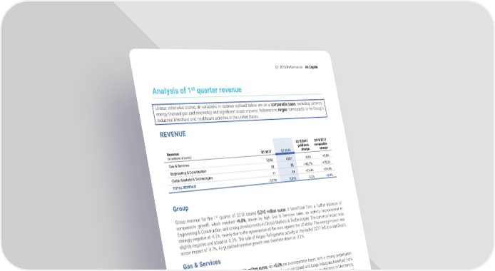 Q1 2018 Performance – Air Liquide st Analysis of 1 quarter revenue Unless otherwise stated, all variations in revenue outlined below are on a comparable basis, excluding currency, energy (natural gas and electricity) and significant scope impacts. Reference to Airgas corresponds to the Group’s Industrial Merchant and Healthcare activities in the United States. REVENUE 2018/2017 2018/2017 Revenue published comparable (in millions of euros) Q1 2017 Q1 2018 change change Gas & Services 5,046 4,831 -4.3% +5.0% Engineering & Construction 53 85 +62.7% +75.2% Global Markets & Technologies 77 94 +21.4% +24.4% TOTAL REVENUE 5,176 5,010 -3.2% +6.0% Group st Group revenue for the 1 quarter of 2018 totaled 5,010 million euros. It benefitted from a further increase of comparable growth which reached +6.0%, driven by high Gas & Services sales, an activity improvement in Engineering & Construction and strong developments in Global Markets & Technologies. The currency impact was strongly negative at -8.2%, mainly due to the appreciation of the euro against the US dollar. The energy impact was slightly negative and stood at -0.3%. The sale of Airgas Refrigerants activity at the end of 2017 led to a significant scope impact of -0.7%. As published revenue growth was therefore down at -3.2%. Gas & Services Gas & Services revenue reached 4,831 million euros, up +5.0% on a comparable basis, with a strong contribution from all business lines and regions. Industrial Merchant growth was sustained and Large Industries benefited from a major start-up in South Africa; growth was solid in Healthcare and demand remained very dynamic in Electronics, in line with the 4th quarter of 2017. As published sales were down -4.3% due to negative currency, energy and significant scope impacts (at -8.3%, -0.3% and -0.7% respectively). 2018/2017 2018/2017 published comparable (in millions of euros) Q1 2017 Q1 2018 change change Americas 2,142 1,901 -11.3% +4.5% Europe 1,710 1,753 +2.5% +3.3% Asia-Pacific 1,024 1,016 -0.8% +6.8% Middle East & Africa 170 161 -5.4% +16.7% GAS & SERVICES REVENUE 5,046 4,831 -4.3% +5.0% Large Industries 1,392 1,365 -1.9% +6.0% Industrial Merchant 2,384 2,208 -7.4% +4.2% Healthcare 850 850 -0.1% +4.9% Electronics 420 408 -3.1% +5.7% PAGE 4/11