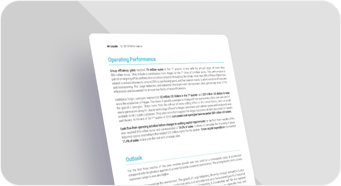 Air Liquide – Q1 2018 Performance Operating Performance st Group efficiency gains reached 79 million euros in the 1 quarter, in line with the annual target of more than st 300 million euros. They include a contribution from Airgas for the 1 time, of 5 million euros. This performance is part of an ongoing effort and includes numerous projects throughout the Group. More than 50% of these efficiencies related to industrial projects, around 25% to purchasing gains, and the balance mainly to administrative efficiencies and restructuring. The Large Industries and Industrial Merchant were the business lines generating most of the efficiencies and accounted for almost two thirds of total efficiencies. st Additional Airgas synergies represented 22 million US dollars in the 1 quarter and 237 million US dollars in total since the acquisition of Airgas. The share of growth synergies is rising and now represents a little over one third of the quarter’s synergies. These come from the roll-out of cross-selling offers in the United States, such as small onsite generators using Air Liquide technology offered to Airgas customers and cylinder gases and hardgoods now available to Air Liquide customers. They also come from support for Airgas customers in their expansion in Canada and Mexico. At the end of the 1st quarter of 2018, cumulated cost synergies have exceeded 200 million US dollars. Cash flow from operating activities before changes in working capital requirements for the first three months of the year reached 976 million euros and corresponded to 19.5% of sales. It allows in particular the financing of gross industrial capital expenditure that totaled 570 million euros for the quarter. Gross capital expenditure represented 11.4% of sales, in line with the mid-term strategic plan. Outlook For the first three months of this year, revenue growth was very solid on a comparable basis. It accelerated compared with the previous quarters in a more favorable economic environment. The activity level in terms of new customers’ projects was also higher. All activities leveraged on this environment. The growth of Large Industries, driven by stronger demand in Europe and the start-ups and ramp-ups of new production units, is of particular note, as is the sustained growth of Industrial Merchant. This quarter was also marked by improvement in Engineering & Construction and the ever-dynamic development of Global Markets & Technologies. In addition, all geographies were up, especially Asia, with double-digit sales growth in China. The Group continues to generate recurring operational efficiency gains and new synergies related to the integration st of Airgas. Cash flow remains high, allowing for further targeted investments. In the 1 quarter, investment decisions amounted to nearly 600 million euros and will contribute to the future growth of the Group. Accordingly, assuming a comparable environment, Air Liquide is confident in its ability to deliver net profit growth in 2018, calculated at constant exchange rate and excluding 2017 exceptionals1. 1 2017 exceptionals: exceptional non-cash items having a net positive impact on 2017 net profit. Page 9/11
