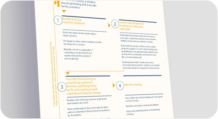 HOW TO GET YOUR FIRST 10 CUSTOMERS 3 KEY PRINCIPLES What’s your message? Define a pain you are solving, a solution you are providing and a benefit to the customer. 1 Identify & list out 2 Convert cold prospects to customer prospects meetings by crafting the right hook · Define the criteria of who would make a · Email subject line should include the first name of target customer. your target to grab their attention, with a one liner distilling the key value you will drive for them. · Use Jigsaw or other contact databases to build . out a long list of contacts. · Body should be succinct (10 lines or less) to allow w they prospect to qualify if it is a fit. It should intrigue and · Mentally commit to a gameplan of speak directly to the pain point/gain statement you contacting a certain number on a provide. Ask for a minimally committal next step – regular schedule (for example, 5 like a 20 minute phone call. our message new emails/day). omers and hoe y · Email signature should contain your contact t a information (phone number, website), more detailed er tial custt it information about the company and endorsements. en our pot Focus the first meeting on . Based on tha t unearthing customer’s oduc 3 interests, qualifying if they 4 After the meeting are fit, and creating mutual our pr commitment towards closing n about the needs of y· Prioritize time on having customer speak about · Send a follow up email articulating what they agreed ear ould use y their interests and intent. to in the meeting. L w · Show a minimal pitch that covers only the salient · Put forth a next step to continue the dialogue. points to determine if their interests are addressed by the solution. · Adjust your positioning based on the learnings receiving. · Match any requests they put on you with requests back on them to build/qualify if the interest is real. Delay the pricing discussion as much as possible – the pricing can only increase as the customer is further convinced that you will meet their needs. Focus on needs. Get your first 10 customers. the alchemist institute