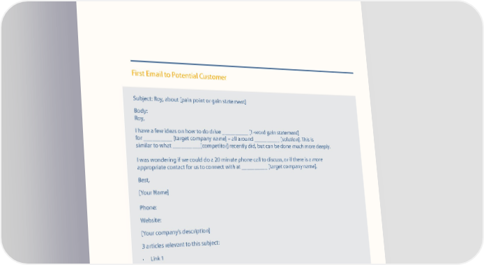HOW TO GET YOUR FIRST 10 CUSTOMERS 5 TEMPLATES First Email to Potential Customer Subject: Roy, about [pain point or gain statement] Body: Roy, I have a few ideas on how to do drive __________ [1-word gain statement] for __________ [target company name] – all around __________ [solution]. This is similar to what __________[competitor] recently did, but can be done much more deeply. I was wondering if we could do a 20 minute phone call to discuss, or if there is a more appropriate contact for us to connect with at __________ [target company name]. Best, [Your Name] Phone: Website: [Your company’s description] 3 articles relevant to this subject: · Link 1 · Link 2 · Link 3 the alchemist institute