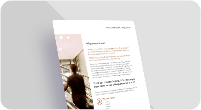 Cancer and Business: Acting Together What happens next? “If I want to, I can. That’s what I thought. And then I had to stop for two months. I was exhausted. It took me a long time to listen to my body’s signals and to take care of myself.” “I had meetings in (any foreign language). I was so tired that even when I tried hard, I couldn’t remember anything”. If you can’t see the side effects of your treatment, it’s as if they don’t exist. Consider discussing your problem with your manager, HR manager, or occupational physician. Don’t ask too much from yourself. Listen to yourself, like you’d listen to someone else. It’s not complaining if you simply say something is wrong and look for a solution. Problems with fatigue, poor concentration and poor memorisation are common. Talk about them as soon as possible. You’ll avoid misunderstandings and receive support. You’re part of the professional circle. How can you make it easy for your colleague to return to work? To make your colleague feel welcome on the day of their return, you should prepare in advance. This support should also be consistent over time. The core values: – Home – Support – Positivity – Team The right words: – Feel free to tell me what you’d like to see on your return. – You can count on us over the long term. – I’m glad to see you again. The right attitudes: – Preparing for their return and taking the time to welcome them. – Being there for them and listening. – Giving your colleague the chance to talk about their illness in a way that suits them. – Respecting confidentiality – Giving them an active role. – Showing flexibility and understanding. Things managers and HR should watch out for: Side effects or traces of the illness can last for a number of years. Their return isn’t limited to the day they resume work; it’s a long-term process. 11