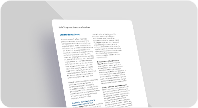 Global Corporate Governance Guidelines Shareholder resolutions our vote direction, we take into account the company’s current state of policies and AllianzGI customarily reviews shareholder disclosure, the potential impact of non- proposals concerning corporate governance compliance as well as the nature and scope of and broader sustainability issues, including for the company’s operations. AllianzGI supports example proposals related to climate change proposals asking companies to report on action, reporting on climate change or emissions environmental damage of their operations in and increasingly proposals related to social protected regions. We also support resolutions issues such as gender and racial/ethnic diversity asking companies to adopt recycling strategies. and human rights-related topics. Given the AllianzGI votes for proposals requesting a variety and variability of shareholder proposals, company to report on or adopt a policy on it is often difficult to develop policy positions on water-related risks. the issues raised by shareholders; hence we prefer to review and vote on a case-by-case Product Safety and Toxic/Hazardous basis, taking account of factors such as the Materials: AllianzGI supports proposals nature of the proposal, whether it might be requesting that a company reports on its overly prescriptive in nature as well as the policies, initiatives, procedures, and oversight company’s policies and progress. Nevertheless, mechanisms related to toxic/hazardous the positions described below outline our materials or product safety in its supply chain, as general voting stance in particular areas. well as resolutions requesting that companies develop a feasibility assessment to phase out AllianzGI supports proposals that ask company certain toxic/hazardous materials, or evaluate boards and management to enhance and disclose the potential financial and legal transparency, adhere to internationally risks associated with utilizing certain materials. recognized standards and principles, and give greater consideration to sustainability issues Diversity and human capital management: deemed material to the long-term performance AllianzGI supports proposals seeking enhanced of the company or to key stakeholders (eg, reporting of the company’s efforts to enhance employees, local communities). diversity of boards, management and workforce. We will support shareholder proposals seeking Shareholder resolutions relating to enhanced reporting of human capital data, environmental and social issues including composition of the workforce, Climate change: AllianzGI supports shareholder employee turnover, absenteeism rates, gender proposal asking companies to report on their diversity, racial/ethnic diversity, and other useful climate change strategy in alignment with the indicators that help investors assess companies’ Paris Agreement and within the framework human capital management practices. AllianzGI described above as well as environmental supports resolutions seeking introduction of policies. We support shareholder proposals policies and statements that explicitly prohibit seeking information on climate-related financial, discrimination and promote equal opportunities physical or regulatory risks and how the at investee companies. We support resolutions company identifies, measures, and manages asking for improved reporting on gender and such risks. We support shareholder proposals racial/ethnic pay gaps taking into account the calling for the reduction of GHG emissions, company’s policies and disclosure as well as subject to our assessment of the company’s recent controversies. If required in our view, we efforts and improvements achieved. We also may support proposals requesting external vote for shareholder proposals requesting a audit of the issue. report/disclosure of a company’s goals on GHG emissions from operations and/or products as Human Rights and Labour Rights: AllianzGI well as progress against these goals. AllianzGI supports proposals requesting a report on the supports proposals requesting that a company company’s or its suppliers’ labour and/or human report on its energy efficiency policies and the rights standards and policies, as well as feasibility of developing/switching to renewable implementation of human rights standards and energy sources. workplace codes of conduct in general and in relation to countries in which there are Environmental impact: AllianzGI supports systematic violations of human rights. AllianzGI resolutions that ask companies to outline may support shareholder proposals that call for environmental policies and the community independent monitoring programs in impact of their operations. When determining conjunction with recognized human rights 20