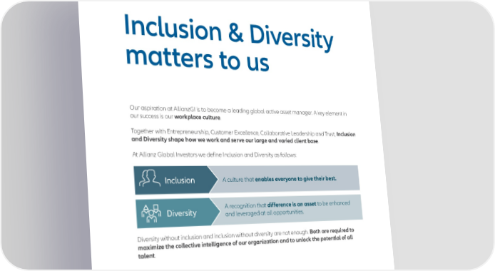 Inclusion & Diversity matters to us Our aspiration at AllianzGI is to become a leading global active asset manager. A key element in our success is our workplace culture. Together with Entrepreneurship, Customer Excellence, Collaborative Leadership and Trust, Inclusion and Diversity shape how we work and serve our large and varied client base. At Allianz Global Investors we define Inclusion and Diversity as follows: Inclusion A culture that enables everyone to give their best. Diversity A recognition that difference is an asset to be enhanced and leveraged at all opportunities. Diversity without inclusion and inclusion without diversity are not enough. Both are required to maximize the collective intelligence of our organization and to unlock the potential of all talent. 2