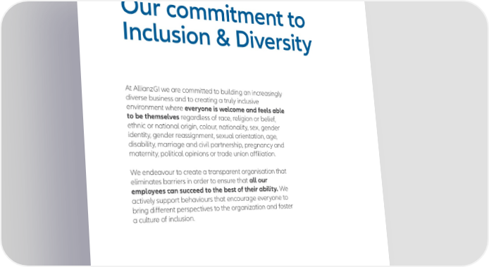 Our commitment to Inclusion & Diversity At AllianzGI we are committed to building an increasingly diverse business and to creating a truly inclusive environment where everyone is welcome and feels able to be themselves regardless of race, religion or belief, ethnic or national origin, colour, nationality, sex, gender identity, gender reassignment, sexual orientation, age, disability, marriage and civil partnership, pregnancy and maternity, political opinions or trade union affiliation. We endeavour to create a transparent organisation that eliminates barriers in order to ensure that all our employees can succeed to the best of their ability. We actively support behaviours that encourage everyone to bring different perspectives to the organization and foster a culture of inclusion. 5