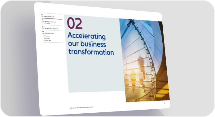 01 Our commitment to I&D 02 Accelerating our business transformation 03 02 Our I&D strategy and priorities 04 Our progress in 2021 – Workplace Accelerating – Workforce – Marketplace our business transformation AllianzGI Inclusion and Diversity Report 2021 07