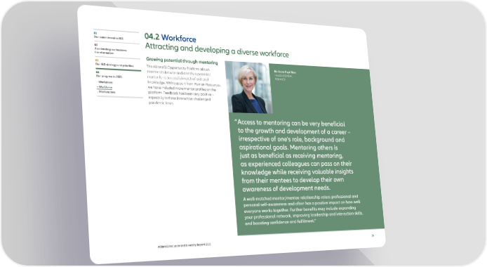 01 04.2 Workforce Our commitment to I&D Attracting and developing a diverse workforce 02 Accelerating our business transformation Growing potential through mentoring 03 Barbara Rupf Bee Our I&D strategy and priorities The AllianzGI Opportunity Platform allows Head of EMEA, mentees to browse and identify a potential AllianzGI 04 mentor for a successful match of skill and Our progress in 2021 – Workplace knowledge. With support from Human Resources, – Workforce we have included more mentor profiles on the – Marketplace platform. Feedback has been very positive – especially in these interaction-challenged pandemic times. “Access to mentoring can be very beneficial to the growth and development of a career – irrespective of one’s role, background and aspirational goals. Mentoring others is just as beneficial as receiving mentoring, as experienced colleagues can pass on their knowledge while receiving valuable insights from their mentees to develop their own awareness of development needs. A well-matched mentor/mentee relationship raises professional and personal self-awareness and often has a positive impact on how well everyone works together. Further benefits may include expanding your professional network, improving leadership and interaction skills, and boosting confidence and fulfilment.” AllianzGI Inclusion and Diversity Report 2021 35
