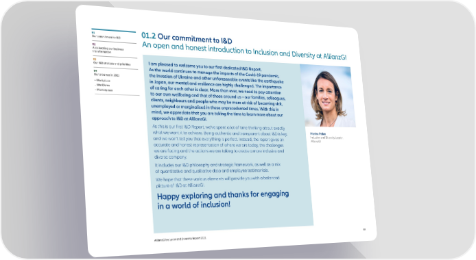 01 01.2 Our commitment to I&D Our commitment to I&D An open and honest introduction to Inclusion and Diversity at AllianzGI 02 Accelerating our business transformation 03 I am pleased to welcome you to our first dedicated I&D Report. Our I&D strategy and priorities As the world continues to manage the impacts of the Covid-19 pandemic, 04 the invasion of Ukraine and other unforeseeable events like the earthquake Our progress in 2021 – Workplace in Japan, our mental and resilience are highly challenged. The importance – Workforce of caring for each other is clear. More than ever, we need to pay attention – Marketplace to our own wellbeing and that of those around us – our families, colleagues, clients, neighbours and people who may be more at risk of becoming sick, unemployed or marginalised in these unprecedented times. With this in mind, we appreciate that you are taking the time to learn more about our approach to I&D at AllianzGI. As this is our first I&D Report, we’ve spent a lot of time thinking about exactly what we want it to achieve. Being authentic and transparent about I&D is key, Marine Palies and we won’t tell you that everything is perfect. Instead, the report gives an Inclusion and Diversity Leader, AllianzGI accurate and honest representation of where we are today, the challenges we are facing and the actions we are taking to create a more inclusive and diverse company. It includes our I&D philosophy and strategic framework, as well as a mix of quantitative and qualitative data and employee testimonials. We hope that these various elements will provide you with a balanced picture of I&D at AllianzGI. Happy exploring and thanks for engaging in a world of inclusion! AllianzGI Inclusion and Diversity Report 2021 03