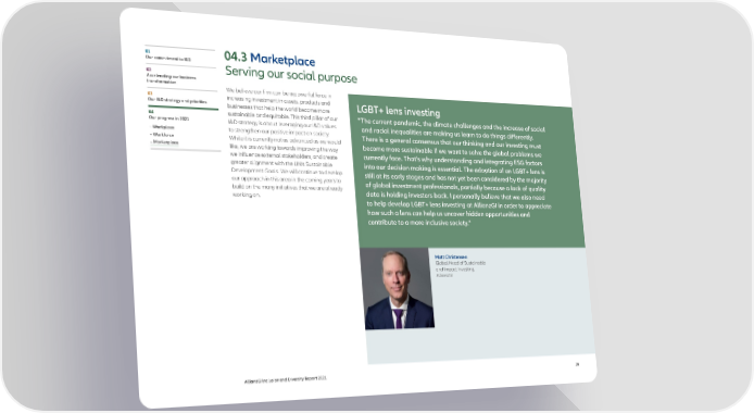 01 04.3 Marketplace Our commitment to I&D Serving our social purpose 02 Accelerating our business transformation We believe our firm can be a powerful force in 03 increasing investment in assets, products and Our I&D strategy and priorities businesses that help the world become more LGBT+ lens investing 04 sustainable and equitable. This third pillar of our “The current pandemic, the climate challenges and the increase of social Our progress in 2021 I&D strategy is about leveraging our I&D values and racial inequalities are making us learn to do things differently. – Workplace to strengthen our positive impact on society. There is a general consensus that our thinking and our investing must – Workforce While it is currently not as advanced as we would become more sustainable if we want to solve the global problems we – Marketplace like, we are working towards improving the way we influence external stakeholders, and create currently face. That’s why understanding and integrating ESG factors greater alignment with the UN’s Sustainable into our decision making is essential. The adoption of an LGBT+ lens is Development Goals. We will continue to develop still at its early stages and has not yet been considered by the majority our approach in this area in the coming years to of global investment professionals, partially because a lack of quality build on the many initiatives that we are already data is holding investors back. I personally believe that we also need working on. to help develop LGBT+ lens investing at AllianzGI in order to appreciate how such a lens can help us uncover hidden opportunities and contribute to a more inclusive society.” Matt Christensen Global Head of Sustainable and Impact Investing, AllianzGI AllianzGI Inclusion and Diversity Report 2021 38