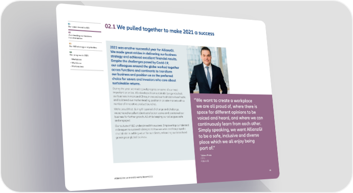 01 02.1 We pulled together to make 2021 a success Our commitment to I&D 02 Accelerating our business transformation 03 2021 was another successful year for AllianzGI. Our I&D strategy and priorities We made great strides in delivering our business 04 strategy and achieved excellent financial results. Our progress in 2021 – Workplace Despite the challenges posed by Covid-19, – Workforce our colleagues around the globe worked together – Marketplace across functions and continents to transform our business and position us as the preferred choice for savers and investors who care about sustainable returns. During the year, we made good progress on some of our most important priorities. We developed our sustainability agenda, built our business in mainland China, increased our foothold in Asia Pacific “ We want to create a workplace and bolstered our market-leading position in private markets with a number of innovative product launches. we are all proud of, where there is We’re proud that, during this period of change and challenge, space for different opinions to be we achieved excellent client satisfaction scores and positioned our business for further growth. All while keeping our colleagues safe voiced and heard, and where we can and engaged. Our culture of I&D underpinned this success. Empowering our talented continuously learn from each other. colleagues to succeed is integral to how we work and has played a Simply speaking, we want AllianzGI crucial role in adding value for our clients, enhancing our brand and growing our global business. to be a safe, inclusive and diverse place which we all enjoy being part of.” Tobias Pross CEO, AllianzGI AllianzGI Inclusion and Diversity Report 2021’ 08