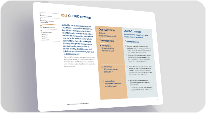 01 03.1 Our I&D strategy Our commitment to I&D 02 Accelerating our business transformation Guided by our business strategy, our 03 I&D strategy is organised across three Our I&D vision Our I&D purpose Our I&D strategy and priorities key pillars – Workplace, Workforce Active is: I&D shapes how we work and serve 04 and Marketplace. Under these pillars, Our progress in 2021 Succeeding as yourself. our clients and communities. – Workplace we have set five priorities for the next – Workforce year (or in the medium term) to help The three pillars: Current priorities: – Marketplace our workforce thrive, by looking at diversity through the interconnected 1. Workplace: 1. Build a safe work culture and a healthy and overlapping perspectives of How does it feel workplace: enhance psychological safety and gender identity, disability, race and to work for us ? wellbeing through relevant practices, policies, ethnicity, sexual orientation, age and tools, trainings and communication social background. 2. Understand the employee experience and We view I&D challenges through an intersectional engagement through an I&D lens: collect lens because none of us should be defined by just and analyse diversity data and feedback one facet of our identity. We must be sensitive to throughout the employee lifecycle discrimination against the different elements of a person’s identity. 2. Workforce: 3. Attract and develop a wide variety of talent Who do we recruit to grow the diversity of our workforce at and grow ? all levels, including senior management, paying special attention to gender, ethnicity, sexual orientation and disability 3. Marketplace: 4. Embed I&D in our investment and How do we serve our sustainability activities to serve our social purpose ? social purpose 5. Expand our activities to serve additional social objectives beyond financial literacy AllianzGI Inclusion and Diversity Report 2021 11