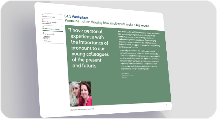 01 04.1 Workplace Our commitment to I&D Pronouns matter: showing how small words make a big impact 02 Accelerating our business transformation 03 As a member of the LGBT+ community myself, and parent Our I&D strategy and priorities “I have personal to a non-binary young adult, embracing my child’s 04 pronouns was a big part of showing acceptance Our progress in 2021 experience with – Workplace and eventually feeling acceptance. By encouraging – Workforce colleagues to add pronouns to our email signatures, – Marketplace the importance of AllianzGI shows its support of diversity in a tangible way, pronouns to our inviting our participation. I especially appreciated the explanation around normalising the use of pronouns. That is exactly why young colleagues those of us who think our pronouns are obvious should consider specifying them in our signatures. Sensitivity of the present to such matters is uncommon in the corporate world, especially in financial services. I am proud to work and future. for a company which acknowledges its corporate responsibility and promotes allyship.” Jenni Killmer Business Analyst Sales, AllianzGI AllianzGI Inclusion and Diversity Report 2021 17