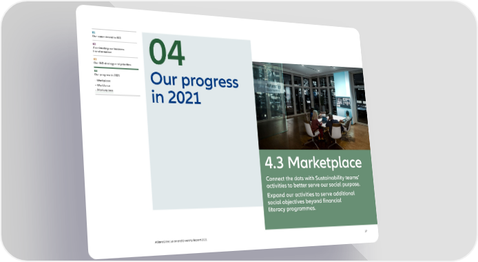 01 Our commitment to I&D 02 Accelerating our business transformation 03 04 Our I&D strategy and priorities 04 Our progress in 2021 – Workplace Our progress – Workforce – Marketplace in 2021 4.3 Marketplace Connect the dots with Sustainability teams’ activities to better serve our social purpose. Expand our activities to serve additional social objectives beyond financial literacy programmes. AllianzGI Inclusion and Diversity Report 2021 37