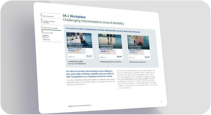 01 04.1 Workplace Our commitment to I&D Challenging misconceptions around disability 02 Accelerating our business transformation 03 In recognition of 2021 International Day of People with Disabilities, we have shared three mini guides Our I&D strategy and priorities 04 Our progress in 2021 – Workplace – Workforce – Marketplace Understanding visible Changing perspective on disability Being inclusive: practical tips and non-visible disabilities Our aim is to provide a safe workplace where colleagues We have celebrated International Day of People with Disabilities since feel comfortable not hiding a disability and can contribute 2017 to raise awareness about the different forms disability can take, their full potential to our company’s and clients’ success. both visible and invisible, and promote disability inclusion. In 2021, our aim was to build a common understanding of disability, breaking It’s crucial we educate ourselves about disability to challenge misperceptions down myths and challenges to help create a globally inclusive and and understand how we can better support our colleagues, family members accessible environment for our employees, clients and communities. and friends with disabilities. We shared three mini guides on understanding visible and non-visible disabilities, to change perspectives on disability and share practical tips on how to be inclusive. AllianzGI Inclusion and Diversity Report 2021 22
