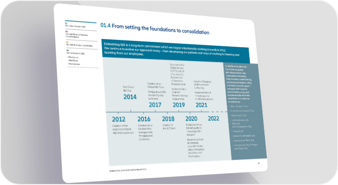 01 01.4 From setting the foundations to consolidation Our commitment to I&D 02 Accelerating our business transformation 03 Embedding I&D is a long-term commitment which we began intentionally working towards in 2012. Our I&D strategy and priorities We continue to evolve our approach today – from developing our policies and ways of working to listening and 04 learning from our employees. Our progress in 2021 – Workplace – Workforce Signature of the In addition we celebrate – Marketplace United Nations the following global LGBT Standard I&D milestones to raise of Conduct for awareness on diversity, Business and help increase understanding, of Women in Launch of Rungway provide psychological safety Creation of our Finance Charter and the Random and tolerance and support First Global Global I&D Policy Implementation Coffee App amongst both majority I&D Day Setting of our 2020 of global Implementation of and minority groups and Gender Equality Financial Literacy virtual yoga and to demonstrate the firm’s 2014 ambitions programmes mindfulness sessions commitment to inclusion 2017 2019 2021 and diversity: • Black History Month • International Women’s Day 2012 2016 2018 2020 2022 • World Health Day • Cultural Diversity for Creation of the Creation of our Creation of Publication of our Dialogue regional and local Flexible Work the I&D Team first I&D guide on and Development Day I&D Working Groups Arrangements “Fostering LGBT+ • Pride Month Principles and Inclusion” Guidelines • World Mental Health Day Revamping of our I&D strategy • International Men’s Day around three key • International Day of People pillars: Workplace, with Disabilities Workforce, and Marketplace AllianzGI Inclusion and Diversity Report 2021 05