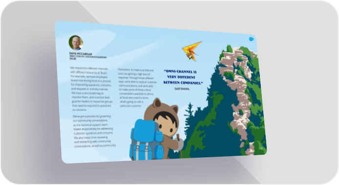 DAVE MCCARGAR DIRECTOR OF CUSTOMER SUPPORT SKUID We respond to different channels champions, to make sure that end “Omni-channel is with different resources at Skuid. users are getting a high level of very different For example, we have employed response. Through those different brand monitoring tools in a process ways, we’re able to capture customer between companies.” for channeling questions, concerns, communications, and we’re able and requests in a timely manner. to make some of those critical GADI SHAMIA We have a structured way to conversations available to others monitor them, and a service-level at Skuid who need to know goal for leaders in respective groups what’s going on with a that need to respond to questions particular customer. or concerns. We’ve got a process for governing our community conversations, so the technical support team shares responsibility for addressing customer questions and concerns. We also invest time reviewing and interacting with community conversations, as well as community 14