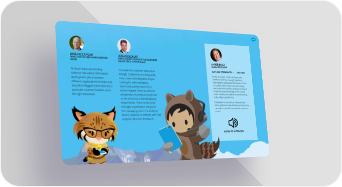 DAVE MCCARGAR JOSH GOLDLUST DIRECTOR OF CUSTOMER SUPPORT DIRECTOR OF PRODUCT MANAGEMENT SKUID SALESFORCE LIVEMESSAGE AMBER BOAZ SALESFORCE MVP At Skuid, there are standing Consider the customer interaction SUCCESS COMMUNITY > TWITTER> cadence calls where information triangle. Customers very frequently Amber is an aunt, runner, volunteer, and sharing takes place between may come in thinking that they’re Salesforce MVP. She has eight Salesforce different organizations to make sure looking for sales assistance, certifications including Certified Service Cloud Consultant, which helps companies design any yellow-flagged information for a and it very quickly turns into a and implement solutions using Service Cloud. particular customer bubbles up to service request. From a customer Amber has deep knowledge of the contact the right individuals. perspective, it’s rarely uniquely one center industry and experience administering or the other, but a blend between and configuring Salesforce. departments. There needs to be Click below to hear Amber interview Dave very tight coordination not just in McCargar to learn about Skuid and how its app can help companies improve their customer the messaging, but in the ability to service. service, respond, or interact with that customer from the first touch. LISTEN TO INTERVIEW 10