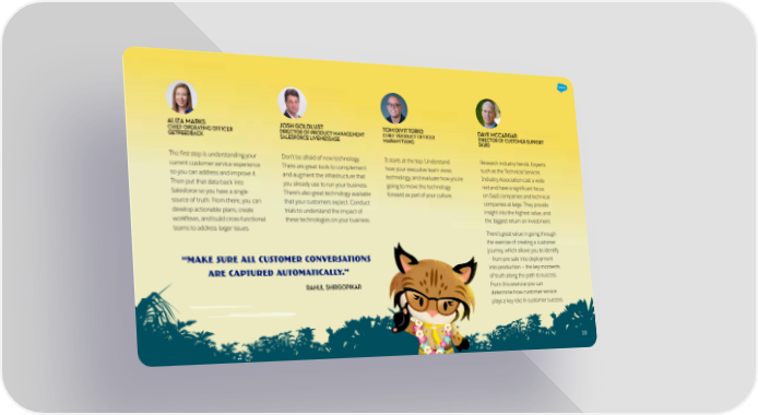 ALIZA MARKS JOSH GOLDLUST TOM DIVITTORIO DAVE MCCARGAR CHIEF OPERATING OFFICER DIRECTOR OF PRODUCT MANAGEMENT CHIEF PRODUCT OFFICER DIRECTOR OF CUSTOMER SUPPORT GETFEEDBACK SALESFORCE LIVEMESSAGE MAPANYTHING SKUID The first step is understanding your Don’t be afraid of new technology. It starts at the top. Understand Research industry trends. Experts current customer service experience There are great tools to complement how your executive team views such as the Technical Services so you can address and improve it. and augment the infrastructure that technology, and evaluate how you’re Industry Association cast a wide Then put that data back into you already use to run your business. going to move the technology net and have a significant focus Salesforce so you have a single There’s also great technology available forward as part of your culture. on SaaS companies and technical source of truth. From there, you can that your customers expect. Conduct companies at large. They provide develop actionable plans, create trials to understand the impact of insight into the highest value, and workflows, and build cross-functional these technologies on your business. the biggest return on investment. teams to address larger issues. There’s great value in going through the exercise of creating a customer journey, which allows you to identify “Make sure all customer conversations – from pre-sale into deployment are captured automatically.” into production – the key moments of truth along the path to success. RAHUL SHIRGOPIKAR From this exercise you can determine how customer service plays a key role in customer success. 19