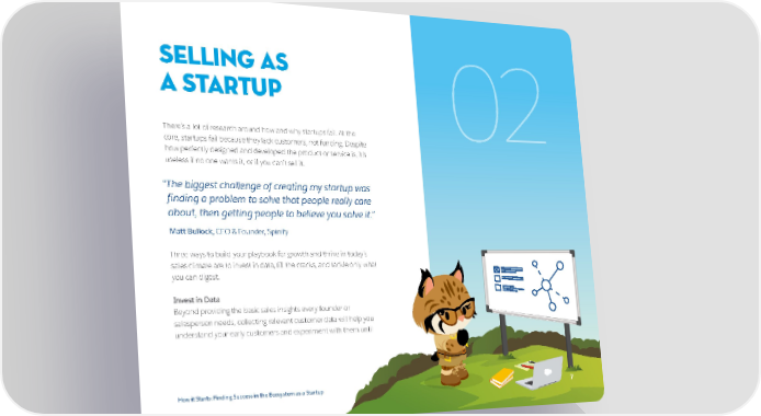 Selling as a Startup 02 There’s a lot of research around how and why startups fail. At the core, startups fail because they lack customers, not funding. Despite how perfectly designed and developed the product or service is, it’s useless if no one wants it, or if you can’t sell it. “The biggest challenge of creating my startup was finding a problem to solve that people really care about, then getting people to believe you solve it.” Matt Bullock, CEO & Founder, Spinify Three ways to build your playbook for growth and thrive in today’s sales climate are to invest in data, fill the cracks, and tackle only what you can digest. Invest in Data Beyond providing the basic sales insights every founder or salesperson needs, collecting relevant customer data will help you understand your early customers and experiment with them until How it Starts: Finding Success in the Ecosystem as a Startup 77