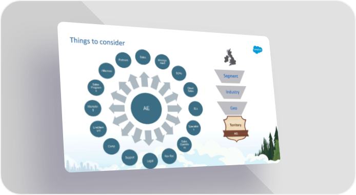 Things to consider Sales Manage Partners ment Alliances SDRs Segment Sales Cloud Program Sales Industry s Marketin AE SEs Geo g Enablem Specialist Territory ent s AE1 Sales Comp Operatio ns Support Rev Rec Legal