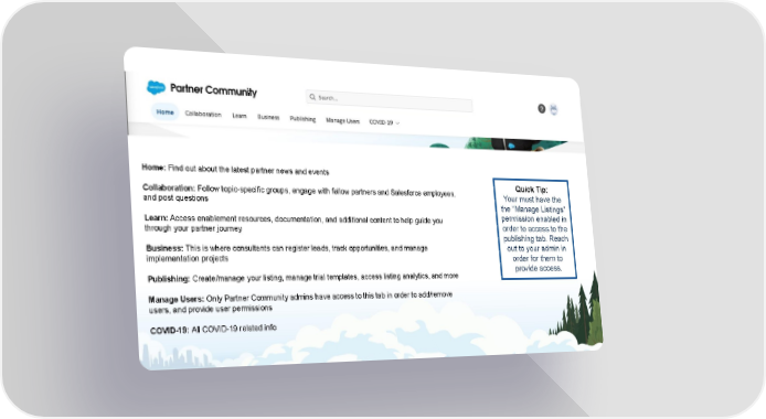 Home Page: Navigation Home: Find out about the latest partner news and events Quick Tip: Collaboration: Follow topic-specific groups, engage with fellow partners and Salesforce employees, Your must have the and post questions the “Manage Listings” permission enabled in Learn: Access enablement resources, documentation, and additional content to help guide you order to access to the through your partner journey publishing tab. Reach Business: This is where consultants can register leads, track opportunities, and manage out to your admin in implementation projects order for them to provide access. Publishing: Create/manage your listing, manage trial templates, access listing analytics, and more Manage Users: Only Partner Community admins have access to this tab in order to add/remove users, and provide user permissions COVID-19: All COVID-19 related info