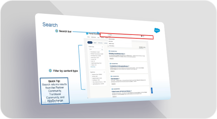 Partner Community User Guide Page 22 Page 24Search Search bar Filter by content type Quick Tip: Search returns results from the Partner Community, Trailblazer Community, and AppExchange.