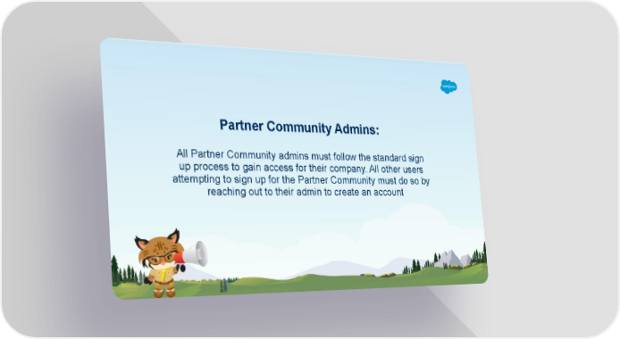 Partner Community Admins: All Partner Community admins must follow the standard sign up process to gain access for their company. All other users attempting to sign up for the Partner Community must do so by reaching out to their admin to create an account