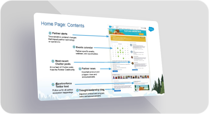 Home Page: Contents Partner alerts Time-sensitive updates/ changes that impact partner technology or operations. Events calendar Partner-specific events, webinars, and opportunities Most recent Chatter posts A live feed of Chatter posts Partner news from the Partner Community Important product and program news and announcements @partnerforce Twitter feed Follow us for all partner Thought-leadership blog ecosystem happenings Important product and program news and announcements