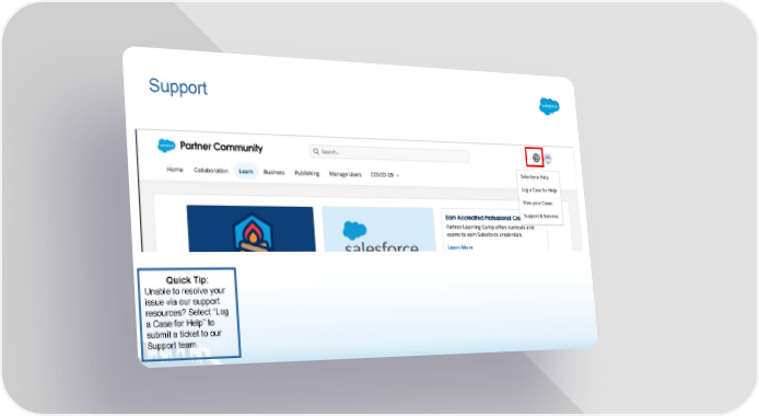 Partner Community User Guide Page 25 Page 27Support Quick Tip: Unable to resolve your issue via our support resources? Select “Log a Case for Help” to submit a ticket to our Support team.