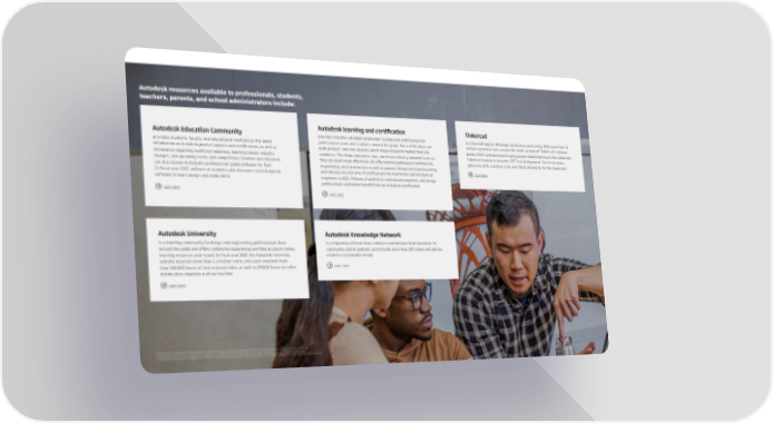 Autodesk resources available to professionals, students, teachers, parents, and school administrators include: Autodesk learning and certi昀椀cation Tinkercad Autodesk Education Community provides industry-validated skillbuilder courses and certi昀椀cations for is a free web app for 3D design, electronics, and coding. With more than 45 professional users and students around the globe. Our certi昀椀cations are ® ® provides students, faculty, and educational institutions the latest million registered users around the world, Autodesk Tinkercad software information on Autodesk product updates and certi昀椀cations, as well as both product- and role-aligned, which helps recipients market their job builds STEM con昀椀dence by bringing project-based learning to the classroom. information regarding workforce readiness, teaching trends, industry readiness. This helps educators stay current on industry-adopted tools so Tinkercad is proud to bear the ISTE Seal of Alignment. Our lesson plans changes, and upcoming events and competitions. Students and educators they can teach more effectively. We offer learning pathways in architecture, adhere to ISTE, Common Core, and NGSS standards for the classroom. * engineering, and construction as well as product design and manufacturing, can also access Autodesk’s professional-grade software for free. In 昀椀scal year 2022, millions of students and educators used Autodesk and introduced a full line of certi昀椀cations for machinists and mechanical Learn more software to learn design and make skills. engineers in 2021. Millions of architects, mechanical engineers, and design professionals worldwide bene昀椀t from an Autodesk Certi昀椀cation. Learn more Learn more Autodesk University Autodesk Knowledge Network is a learning community for design and engineering professionals from is a repository of more than a million contributions from Autodesk, its around the globe and offers conference experiences and free access to online community, and its partners, and includes more than 250 videos and articles learning resources year-round. In 昀椀scal year 2022, the Autodesk University related to sustainable design. website received more than 2.4 million visits, and users watched more than 133,000 hours of instructional video, as well as 29,500 hours on other Learn more distribution channels such as YouTube. Learn more * Free Autodesk software and/or cloud-based services are subject to acceptance of and compliance with the terms and conditions of the terms of use and/or other terms that accompany such software or cloud-based services. Software and cloud-based services subject to an Educational license or subscription may be used by eligible users solely for Educational Purposes and shall not be used for commercial, professional, or any other for-pro昀椀t purposes.