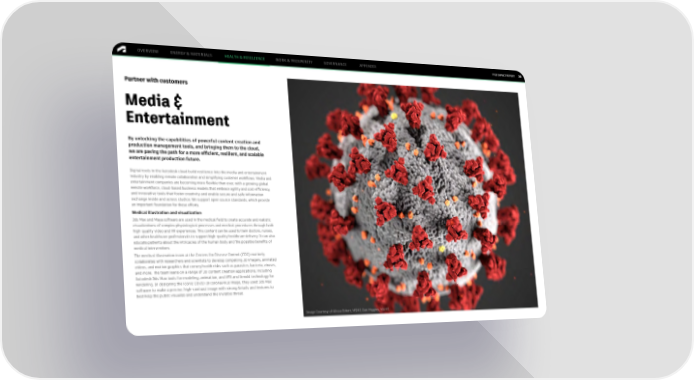 FY22 IMPACT REPORT OVERVIEW ENERGY & MATERIALS HEALTH & RESILIENCE WORK & PROSPERITY GOVERNANCE APPENDIX 36 Partner with customers Media & Entertainment By unlocking the capabilities of powerful content creation and production management tools, and bringing them to the cloud, we are paving the path for a more efficient, resilient, and scalable entertainment production future. Digital tools in the Autodesk cloud build resilience into the media and entertainment industry by enabling remote collaboration and simplifying customer workflows. Media and entertainment companies are becoming more flexible than ever, with a growing global remote workforce, cloud-based business models that embrace agility and cost-efficiency, and innovative tools that foster creativity and enable secure and safe information exchange inside and across studios. We support open source standards, which provide an important foundation for these efforts. Medical illustration and visualization 3ds Max and Maya software are used in the medical field to create accurate and realistic visualizations of complex physiological processes and medical procedures through both high-quality video and VR experiences. This content can be used to train doctors, nurses, and other healthcare professionals to support high-quality healthcare delivery. It can also educate patients about the intricacies of the human body and the possible benefits of medical interventions. The medical illustration team at the Centers for Disease Control (CDC) routinely collaborates with researchers and scientists to develop compelling 3D imagery, animated videos, and motion graphics that convey health risks such as parasites, bacteria, viruses, and more. The team leans on a range of 3D content creation applications, including Autodesk 3ds Max tools for modeling, animation, and VFX and Arnold technology for rendering. In designing the iconic COVID-19 coronavirus image, they used 3ds Max software to make a precise, high-contrast image with strong details and textures to best help the public visualize and understand the invisible threat. Image Courtesy of Alissa Eckert, MSMI; Dan Higgins, MAMS