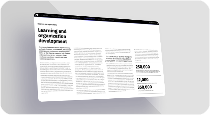 FY22 IMPACT REPORT OVERVIEW ENERGY & MATERIALS HEALTH & RESILIENCE WORK & PROSPERITY GOVERNANCE APPENDIX 44 Improve our operations Learning and organization development To empower innovators to solve important design Autodesk continues to prioritize its people managers as a critical Autodesk outside of the Learning and Development group, are As we continue to navigate the shifting landscape of work with and make, business, environmental, and societal lever for organizational success. The Managing@Autodesk passionate about curating learning experiences for others. This a focus on the future, learning and organization development is challenges, we must support our employees to program served as the primary vehicle to keep all global people community reached 76 members and published nearly 1,000 a key catalyst to build resilience and drive transformation. We thrive so that they can create the best products managers up to date with the latest information and aligned new learning pathways. are committed to continuing to prioritize learning and capability and experiences for our customers. Great with key actions, and provided a venue to share fresh ideas, building to drive lasting behavior and mindset shifts. Through employee experiences translate into great resources, and tools. In 2021, we launched a series of workshops Our community of learning champions intentional design and delivery of learning experiences that scale to help managers and their teams talk about the challenges, reached 76 members and published and broaden access, we help our employees thrive and realize customer experiences. new habits, and opportunities of hybrid work (see Flex Forward). nearly 1,000 new learning pathways. their potential. In addition, people managers enrolled more than 3,700 times Like our customers, our employees need to adapt their skills to in our 16 Managing@Autodesk pathways and completed a total With equitable development in mind, we sponsored external the changing work environment. Putting skills at the center of over 7,800 articles, videos, and podcasts. Autodesk also leadership programming for our underrepresented populations. ensures we are focused on equitable employee experiences, as conducted more than 400 manager education events. Through our partnership with McKinsey & Company, we sponsored skills are objective, quantifiable, and transferable. Through our To help employees upskill on the job and navigate their a year-long professional development program for Black 250,000 Work & Prosperity initiative, activated via our Culture framework, development, the MyLearning platform connects users to the employees, including skill-building, cohort-based learning, and we are reimagining learning and organization development at world’s largest collection of professional learning content from MyLearning connects users to the world’s largest collection Autodesk with a focus on skills that are key to the future of work. virtual networking and webinar events. of professional learning content with over 250,000 courses and both inside and outside Autodesk—over 250,000 digital courses During the year, we also enhanced our internal development more than 3 million articles and videos from 1,300 sources. Responding to the unprecedented number of professionals and more than three million articles and videos from 1,300 sources. program for next-generation leaders. We expanded our Emerging changing jobs, and our own employee surveys, career development The pandemic presented an opportunity for us to democratize Leaders Program to 120 Autodesk employees representing nearly is a key focus at Autodesk. We initiated a project in 2021 to refresh learning by moving to a digital learning environment. Our global all business units and geographies, including the first-ever cohort job family descriptions and define critical skill profiles. This project portfolio of training curriculum shifted to 100% virtual learning to develop women in tech and sales roles. We supported the helps Autodesk identify and articulate the skills that drive success and proved to be so successful that this transformation will personal and professional development of more than 280 people 12,000 in each role at each level, in turn enabling career path development continue into the future. Almost 12,000 employees completed managers and individual contributors through 1:1 professional for employees and a line of sight to the organization’s future skills approximately 350,000 learning modules during fiscal year 2022, development coaching. Participants benefitted from over 2,900 Almost 12,000 employees completed approximately demand. This transformation moves us away from high-level, and nearly every Autodesk employee participated in training static job family descriptions to a data-driven, dynamic framework related to our new brand. coaching sessions, and nearly 80% rated their experience as “life- changing” or “amazing.” We also expanded access to professional, that can be tailored to actionable, skills-based development and The need to develop and roll out learning programs much more on-demand coaching support to over 12,000 Autodesk employees 350,000 career paths. quickly than in past years was supported by Autodesk’s growing worldwide as a zero-cost employee benefit. community of learning champions. These employees, from across learning modules during fiscal year 2022.