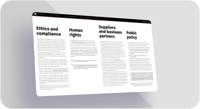 FY22 IMPACT REPORT OVERVIEW ENERGY & MATERIALS HEALTH & RESILIENCE WORK & PROSPERITY GOVERNANCE APPENDIX 70 Suppliers Ethics and Human and business Public compliance rights partners policy At Autodesk, we recognize that every group and individual Autodesk promotes human rights wherever it does business. Our Partner Code of Conduct, expanded in 2022, outlines the Autodesk advocates for public policies around the world involved in our business, from our investors to our resellers to The Autodesk Human Rights Policy describes our commitments standards and practices we require our business partners, that enable people to design and make a better world for all. our customers and coworkers, holds a stake in the future of our in this area, as well as how we promote human rights among including suppliers, vendors, channel partners, and others to We champion public policies in the following areas: company. Our success comes from our shared commitment to our employees, suppliers, business partners, and customers. follow while conducting business with or on behalf of Autodesk. ● Enabling more sustainable construction and manufacturing acting as One Team. Delivering on that commitment requires Autodesk supports and upholds human rights as outlined in the It also specifies that business partners must support ● Advancing digital transformation in the manufacturing and that our relationships with each other be founded on trust and International Bill of Human Rights, which includes the Universal internationally recognized human rights and comply with all architecture, engineering, and construction industries respect, which we must earn every day by always adhering to Declaration of Human Rights, the International Covenant on Civil applicable laws and regulations regarding health and safety in the highest standards of ethical business conduct. and Political Rights, and the International Covenant on Economic, the workplace, the eradication of human trafficking and slavery, ● Protecting consumer privacy and fostering emerging Our Code of Business Conduct (COBC), last updated in February Social, and Cultural Rights. We also support the rights described and the elimination of child labor. We also require our partners technologies 2022, articulates standards of conduct meant to ensure we in the ILO Declaration on Fundamental Principles and Rights to support fair labor practices. If business partners don't abide ● Investing in climate change–resilient buildings do what’s right for all our stakeholders and is aligned with our at Work. by the Partner Code, they are subject to a range of actions, up to and infrastructure Culture Code. termination of their relationship with Autodesk. ● Improving water management, resiliency, and cleanliness During the first quarter of each fiscal year, all Autodesk officers View our Conflict Minerals Policy and Autodesk Limited’s Statement on The Partner Code also promotes supplier diversity, and ● Scaling up skills development for the future of work and active employees, including those of our global subsidiaries, Countering Slavery and Human Trafficking. encourages our US-based suppliers and vendors to certify as are required to review and reaffirm their commitment to the diverse suppliers (if applicable), develop their own supplier ● Advancing equal opportunity, diversity, and inclusion COBC and complete COBC training. For fiscal year 2022, 100% of Learn more about our approach and performance in areas related to human diversity programs, and support diverse businesses. To drive Autodesk does not contribute to individual political candidates. 1 rights such as diversity and belonging, employee health and safety, and GHG emissions reduction in our supplier base, the Partner Code We have a longstanding global policy prohibiting contributions active employees completed this requirement. privacy and data security. Autodesk Foundation also supports human rights Our COBC includes instructions for reporting potential violations through investments that drive progress related to Energy & Materials, encourages our business partners to implement environmental at any level. The company does not have a political action Health & Resilience, and Work & Prosperity. management systems, report GHG emissions to CDP annually, committee. Rarely, Autodesk may engage with 501(c)4s or on of the law or Autodesk policy. Autodesk’s Business Ethics and and set science-based targets by 2026. ballot measures, and we publicly disclose those engagements. Compliance Hotline enables employees and third parties to report suspected violations for investigation and resolution. To embed responsible sourcing into our procurement process, We are committed to complying with all applicable anticorruption in 2022 we are introducing environmental, social, and governance Reflecting enhanced public disclosure of our political laws and regulations. This includes the US Foreign Corrupt questions into our request for proposal (RFP) process and are engagement and a new Board of Directors oversight Practices Act, the UK Bribery Act, and any similar local regulations providing training to relevant sourcing teams on these requirements. policy, Autodesk rose to the First Tier of companies This covers information about fair labor, human rights, GHG in the 2021 CPA-Zicklin Index of Corporate Political in the areas where we operate. Partners must abide by these emissions, and science-based targets for all RFPs globally, and Disclosure and Accountability. Our score of 85.7 (out same standards while conducting business with or on behalf questions about supplier diversity for RFPs in the United States. of 100) was 38.3 points above the IT sector average. of Autodesk. In addition, we have added questions about sustainable business We require periodic anticorruption training for all employees and practices to RFPs worldwide related to IT infrastructure, IT Learn more about our public policy efforts, political contrib
