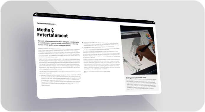 FY22 IMPACT REPORT OVERVIEW ENERGY & MATERIALS HEALTH & RESILIENCE WORK & PROSPERITY GOVERNANCE APPENDIX 61 Partner with customers Media & Entertainment The media and entertainment industry is undergoing a transformation ● Flame on the cloud enables Flame artists to collaborate with one another from virtually as content creators innovate to meet the demands of a dramatic anywhere. Studios running Flame on the cloud can benefit from a scalable and secure increase in high-quality content production globally. work environment with a wide selection of compute and storage services. ● USD workflows in Maya, 3ds Max, Bifrost, and Arnold enable smoother data exchange Pandemic lockdowns and other measures forced studios to expand beyond the traditional both within studios and in the wider production supply chain. model of large teams based in centralized locations and embrace remote workflows. We are also investing in AI-assisted workflows for media and entertainment. Autodesk Utilizing cloud computing, prioritizing communication, and increasing security standards continues to invest in Flame’s machine learning toolset, helping artists automate complex to optimize collaboration across a global workforce has accelerated the transformation compositing and retouching tasks. By combining Flame's powerful AI-powered tools with of content creation. This new approach has enabled studios to hire diverse talent in new the massive compute power and scalability of the cloud, artists can work faster and focus places while reducing production costs. on the artistry of their craft. Supply chains for sourcing and creating content in the media and entertainment industry Autodesk is committed to empower anyone, anywhere, to create amazing entertainment are growing longer and more complex. Studios are desperate for talent, farming out parts and media experiences by providing tools that enable artists to deliver new levels of of the process at unprecedented rates while diversifying where they find qualified talent. creativity, collaboration, productivity, insight, and scale with production in the cloud. This has had a democratizing effect, improving access to opportunity beyond typical We are accelerating the industry’s transition to the future of production by disrupting concentrated media hubs. However, it has also added complexity to project management. traditional processes with new ways of working. Moving forward, we will continue Implementing cloud-based tools and hiring the right mix of talent both play a pivotal working to drive better collaboration through open standards, open project development role in managing decentralized talent creation. ecosystems, and interoperability of tools and platforms. Our tools help teams collaborate more effectively, increasing productivity and saving time Six Key Components to Successfully Navigating Your Remote Workflows and money. For example: ® ® ® ● Autodesk ShotGrid (formerly Autodesk Shotgun ) software streamlines workflows for creative studios by unifying production management, the creative process, and pipelines—in the cloud. ShotGrid enables producers to track and manage every aspect Setting up our own remote studio of their projects, supervisors to streamline the creative process and keep artists focused on the creative task at hand, and technical directors to build customized We’ve seen the pandemic change the way studios work and how artists collaborate pipelines that suit unique studio needs with plug-and-play integrations and an with one another. With remote work becoming the new normal, we decided open ecosystem. to put ourselves in the shoes of our customers by setting up a small remote studio to create a 3D sequence from concept through final render. The animated short, called “Mkali's Mission,” uses each of the tools in the Autodesk Media & Entertainment Collection—including Maya, 3ds Max, Arnold, and Autodesk® Mudbox® software—to showcase the breadth and power of the toolset.