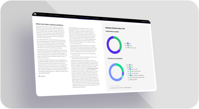 FY22 IMPACT REPORT OVERVIEW ENERGY & MATERIALS HEALTH & RESILIENCE WORK & PROSPERITY GOVERNANCE APPENDIX 50 Attract and retain a diverse workforce Employee workforce data, FY22* We all win when we attract, retain, and advance talented The Autodesk Women in Sales (AWiS) initiative is a cross- individuals. This requires a holistic, multifaceted approach. We functional effort between our human resources and sales Overall workforce, by gender work to integrate inclusive hiring practices into every step of organizations in support our goal to increase the number of our recruitment process, including evaluating and revising job women in sales by 25% over three years. The US Bureau of descriptions to be more inclusive, using market intelligence Labor Statistics reports that women hold just under a third of to identify locations with strong diverse pools of talent, and outside sales roles in the majority of industries, most notably incorporating early career recruitment into our hiring plan manufacturing and technology. Addressing this problem is to develop and cultivate talent. critical to both business success and achieving global gender Our custom-designed five-day virtual Hiring Manager Bootcamp parity in pay and opportunity. The AWiS initiative focuses trains all people managers in Autodesk’s hiring principles and on talent acquisition, development, and retention, as well as 64.9% Male inclusive recruiting practices to help us successfully attract, inclusive cultural practices. 35.0% Female interview, assess, and onboard diverse talent. During 2021, we The Autodesk Women in Digital Enterprise Services (WDES) also launched our Recruiter Bootcamp to onboard new recruiters initiative supports our goal to increase women in tech by 25% 0.1% Choose not to state and refresh current talent acquisition team members. over three years. It includes programming that works to equalize The program covers topics such as mitigating bias in the interview and promote women’s presence within DES through career and process, utilizing diversity partnerships, talent sourcing, writing personal development. Achievements during 2021 include: inclusive job descriptions, and coaching hiring managers on ● Launching the WDES Guilds Program and completing two inclusive hiring practices. All searches for senior directors and Guilds group cycles above must include at least one woman or person of color on ● Hosting training sessions and workshops related to career the final interview slate. advancement, mentorship, and growth US workforce, by race/ethnicity Through the Autodesk Tech Program, we are collaborating with External partnerships are key to reaching a wide array of four Historically Black Colleges and Universities (HBCUs) in the candidates. We collaborate with organizations such as National United States, offering student stipends and mentoring in Action Council for Minorities in Engineering, Lesbians Who Tech, partnership with our technical business units. The program aims AfroTech, Fairygodboss, Techqueria, and Power to Fly to support 62.6% White to create an immersive experience focused on mentorship, our effort. Starting in February 2022, Autodesk committed 24.6% Asian professional development, and solving real technical challenges $150,000 annually for three years to The Hidden Genius Project with engineers at Autodesk. In its inaugural year 2020/2021, to support the next generation of Black tech leaders and 7.0% Hispanic or Latino the program engaged 20 students, in addition to faculty advisors entrepreneurs. These efforts are yielding positive results, with 2.9% Black or African American and Autodesk engineers. more job candidates who identify as women (globally) and people of color (in the United States) than ever before. For 2.3% Two or More Races Learn more example, 39.9% of external hires during fiscal year 2022 were 0.3% Native American or Alaska Native women. Partly as a result, women increased from 33.4% of 0.2% Native Hawaiian or Pacific Islander Autodesk’s overall workforce globally at the end of fiscal year 2020 to 35.0% at the end of fiscal year 2022. In the United States, 0.1% Not specified 7.9% of external hires during fiscal year 2022 were Black. This contributed to the rise from 1.7% of the US workforce that Black employees represented at the end of fiscal year 2020 to 2.9% at the end of fiscal year 2022. * Data are as of the end of fiscal year 2022. See detailed performance metrics in the Data summary.
