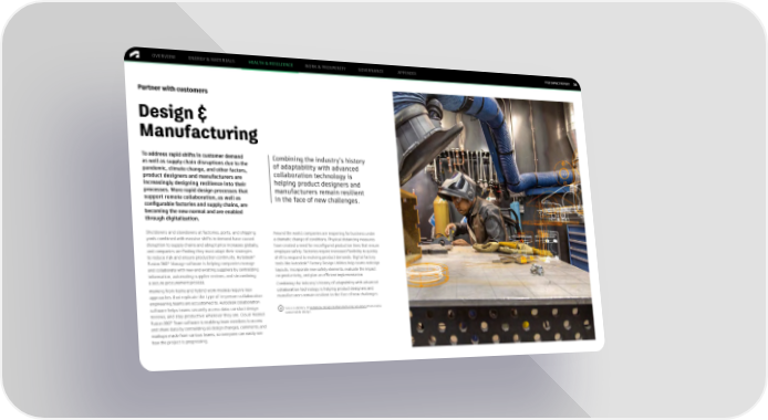 FY22 IMPACT REPORT OVERVIEW ENERGY & MATERIALS HEALTH & RESILIENCE WORK & PROSPERITY GOVERNANCE APPENDIX 34 Partner with customers Design & Manufacturing To address rapid shifts in customer demand Combining the industry’s history as well as supply chain disruptions due to the of adaptability with advanced pandemic, climate change, and other factors, collaboration technology is product designers and manufacturers are helping product designers and increasingly designing resilience into their manufacturers remain resilient processes. More rapid design processes that support remote collaboration, as well as in the face of new challenges. configurable factories and supply chains, are becoming the new normal and are enabled through digitalization. Shutdowns and slowdowns at factories, ports, and shipping Around the world, companies are reopening for business under yards combined with massive shifts in demand have caused a dramatic change of conditions. Physical distancing measures disruption to supply chains and abrupt price increases globally, have created a need for reconfigured production lines that ensure and companies are finding they must adapt their strategies employee safety. Factories require increased flexibility to quickly to reduce risk and ensure production continuity. Autodesk® shift to respond to evolving product demands. Digital factory ® ® Fusion 360 Manage software is helping companies manage tools like Autodesk Factory Design Utilities help teams redesign and collaborate with new and existing suppliers by centralizing layouts, incorporate new safety elements, evaluate the impact information, automating supplier reviews, and streamlining on productivity, and plan an efficient implementation. a secure procurement process. Combining the industry’s history of adaptability with advanced Working from home and hybrid work models require new collaboration technology is helping product designers and approaches that replicate the type of in-person collaboration manufacturers remain resilient in the face of new challenges. engineering teams are accustomed to. Autodesk collaboration software helps teams securely access data, conduct design See a summary of Autodesk Design & Manufacturing solutions that enable reviews, and stay productive wherever they are. Cloud-hosted sustainable design. ® Fusion 360 Team software is enabling team members to access and share data by centralizing all design changes, comments, and markups made from various teams, so everyone can easily see how the project is progressing.