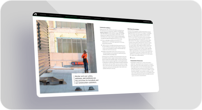 FY22 IMPACT REPORT OVERVIEW ENERGY & MATERIALS HEALTH & RESILIENCE WORK & PROSPERITY GOVERNANCE APPENDIX 31 Construction resiliency Returning to the workplace Worker and user safety, wellness, and resilience are key priorities During the COVID-19 pandemic, health recommendations changed for Autodesk and our construction customers. The Construction how people moved as they returned to the workplace. TheInfraWorks Resiliency Playbook includes examples, insights, and actionable Mobility Simulation tool models people’s movement, bringing steps about how to be more resilient in construction, covering data-driven insight to physical distancing needs and more issues such as creating stronger technology and data programs efficiency of movement through transit centers such as airports and making teams, business models, and processes more resilient. and rail stations. Indoor air quality and proper ventilation Futureproofing steps the Playbook recommends include: make a significant difference for employee and customer safety. ® ● Focus on standards, identifying inconsistencies in With Autodesk CFD software, computational fluid dynamics company practices and finding opportunities to develop simulation can be used for thermal and flow analysis to identify standardized procedures. areas of risk and then explore multiple mitigation strategies ● Create a culture of innovation by actively promoting out-of- for occupant safety—before making any physical changes to the the-box thinking, for example through company-sanctioned building and HVAC systems. Dynamo and Generative Design events such as a hackathon focused on reducing waste from in Revit bring informed decision making to design exploration, design and construction processes. whether for designing for the safe arrangement of desks, the width or spacing of aisles, or other needs. As more people return ● Embrace industrialized construction by utilizing innovative to the workplace, these types of design decisions take on new building techniques such as design for manufacturing and significance. Our offerings can help create more resilient spaces assembly (DfMA) and prefabrication. that support teams working anywhere. ® Construction IQ, in Autodesk Build and Autodesk Construction Cloud platform products, applies machine learning to transform Learn more data into simple and actionable insights. The daily risk assessment Transportation infrastructure feature uses text recognition algorithms to sort through hundreds of data points to categorize and prioritize the highest risk projects, Transportation infrastructure is critical to the health of subcontractors, and issues. When used as an assistant to manage communities. Improving these built environments can improve risk in conjunction with current safety processes and real-world health outcomes and reduce health disparities among residents; experience, Construction IQ helps project teams identify and for example, planners can ensure that major roadways aren’t prioritize risk factors every day. constructed too close to schools and communities more at risk for asthma. Planning processes that include capabilities to predict movement of people—such as Mobility Simulation—can help reduce traffic congestion (and decrease associated GHG emissions Worker and user safety, and air pollution) and ensure safe and accessible evacuation routes in the event of natural disasters. wellness, and resilience are key priorities for Autodesk and our construction customers.