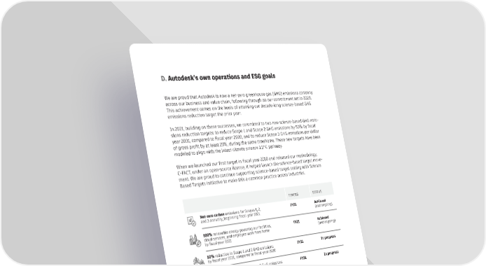 D. Autodesk’s own operations and ESG goals We are proud that Autodesk is now a net‑zero greenhouse gas (GHG) emissions company across our business and value chain, following through on our commitment set in 2020. This achievement comes on the heels of attaining our decade‑long science‑based GHG emissions reduction target the prior year. In 2021, building on these successes, we committed to two new science‑based GHG emis‑ sions reduction targets: to reduce Scope 1 and Scope 2 GHG emissions by 50% by fiscal year 2031, compared to fiscal year 2020, and to reduce Scope 3 GHG emissions per dollar of gross profit by at least 25%, during the same timeframe. These new targets have been modeled to align with the latest climate science 1.5°C pathway. When we launched our first target in fiscal year 2010 and released our methodology, C‑FACT, under an open‑source license, it helped launch the science‑based target move‑ ment. We are proud to continue supporting science‑based target setting with Science Based Targets initiative to make this a common practice across industries. TIMING STATUS Net-zero carbon emissions for Scopes 1, 2, FY21 Achieved and 3 annually, beginning fiscal year 2021 (and ongoing) 100% renewable energy powering our facilities, FY21 Achieved cloud services, and employee work from home (and ongoing) by fiscal year 2021 50% reduction in Scope 1 and 2 GHG emissions FY31 In progress by fiscal year 2031, compared to fiscal year 2020 25% minimum reduction to Scope 3 GHG emissions FY31 In progress per dollar of gross profit by fiscal year 2031, compared to fiscal year 2020 In addition, through the Autodesk Carbon Fund, we support a range of projects globally to enable Autodesk to attain net‑zero GHG emissions. In addition to reducing GHG emis‑ sions, these projects deliver positive outcomes in alignment with our broader impact opportunity areas. During fiscal year 2021, we offset 126,000 metric tons of CO2e through the below projects, ensuring net‑zero GHG emissions across our business and value chain, while delivering positive co‑benefits. Autodesk Sustainability Financing Framework | October 2021 12