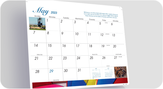 Balloons are not always light-bulb shaped. Many popular characters May 2023 have made their way into the air in a special shaped balloon. Special shaped balloons are featured on Thursday and Friday each year. Sunday Monday Tuesday Wednesday Thursday Friday Saturday 1 2 3 4 5 Full Moon 6 7 8 9 10 11 12 Last Quarter 13 14 15 16 17 18 19 New Moon 20 Mother’s Day Ascension Day Armed Forces Day 21 22 23 24 25 26 27 First Quarter Shavuot April June 28 29 30 31 S M T W T F S S M T W T F S 1 1 2 3 2 3 4 5 6 7 8 4 5 6 7 8 9 10 9 10 11 12 13 14 15 11 12 13 14 15 16 17 16 17 18 19 20 21 22 18 19 20 21 22 23 24 23 24 25 26 27 28 29 25 26 27 28 29 30 Memorial Day 30 244419_Grd.indd 11244419_Grd.indd 11 4/4/22 7:54 AM4/4/22 7:54 AM