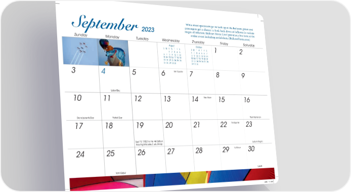 While most spectators get to look up at the balloons, pilots and passengers get a chance to look back down at balloons in various September 2023 stages of inflation. Balloon Fiesta Live! provides a live look at the entire event including aerial shots. (BalloonFiesta.com) Sunday Monday Tuesday Wednesday Thursday Friday Saturday August October S M T W T F S S M T W T F S 1 2 1 2 3 4 5 1 2 3 4 5 6 7 6 7 8 9 10 11 12 8 9 10 11 12 13 14 13 14 15 16 17 18 19 15 16 17 18 19 20 21 20 21 22 23 24 25 26 22 23 24 25 26 27 28 27 28 29 30 31 29 30 31 3 4 5 6 Last Quarter 7 8 9 Labor Day 10 11 12 13 14 New Moon 15 16 Grandparents Day Patriot Day Rosh Hashanah 17 18 19 20 21 22 First Quarter 23 Sept 19, 1783, First Hot Air Balloon Free Flight-Rooster, Duck, Sheep Autumn Begins 24 25 26 27 28 29 Full Moon 30 Yom Kippur Sukkot 244419_Grd.indd 19244419_Grd.indd 19 4/4/22 7:55 AM4/4/22 7:55 AM
