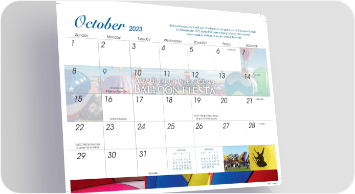Balloon Fiesta started with just 13 balloons in the parking lot of Coronado Center October 2023 in Albuquerque. 2022 marked 50 years of flying balloons that has been experienced by millions of people around the world. Sunday Monday Tuesday Wednesday Thursday Friday Saturday 1 2 3 4 5 6 Last Quarter 7 8 9 10 11 12 13 14 New Moon Columbus Day Indigenous Peoples’ Day 15 16 17 18 19 20 21 First Quarter Oct 19, 1783, First Hot Air Balloon National Boss Day Tether with Human aboard 22 23 24 25 26 27 28 Full Moon Oct 22, 1960, First Free Flight of Modern Hot Air balloon September November 29 30 31 S M T W T F S S M T W T F S 1 2 1 2 3 4 3 4 5 6 7 8 9 5 6 7 8 9 10 11 10 11 12 13 14 15 16 12 13 14 15 16 17 18 17 18 19 20 21 22 23 19 20 21 22 23 24 25 24 25 26 27 28 29 30 26 27 28 29 30 Halloween 244419_Grd.indd 21244419_Grd.indd 21 4/4/22 7:55 AM4/4/22 7:55 AM