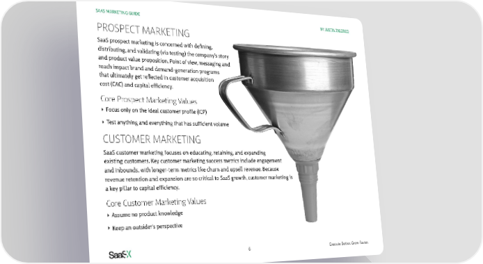 SAAS MARKETING GUIDE BY: JUSTIN TALERICO PROSPECT MARKETING SaaS prospect marketing is concerned with defining, distributing, and validating (via testing) the company’s story and product value proposition. Point of view, messaging and reach impact brand and demand-generation programs that ultimately get reflected in customer acquisition cost (CAC) and capital efficiency. Core Prospect Marketing Values ‣ Focus only on the ideal customer profile (ICP) ‣ Test anything and everything that has sufficient volume CUSTOMER MARKETING SaaS customer marketing focuses on educating, retaining, and expanding existing customers. Key customer marketing success metrics include engagement and inbounds, with longer-term metrics like churn and upsell revenue. Because revenue retention and expansion are so critical to SaaS growth, customer marketing is a key pillar to capital efficiency. Core Customer Marketing Values ‣ Assume no product knowledge ‣ Keep an outsider's perspective 6 Execute Better. Grow Faster.