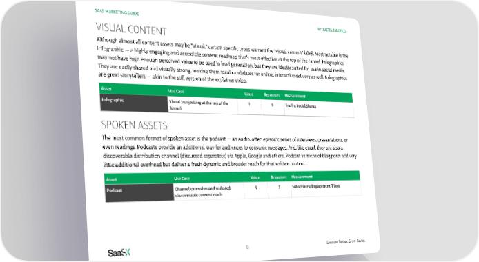 SAAS MARKETING GUIDE BY: JUSTIN TALERICO VISUAL CONTENT Although almost all content assets may be “visual,” certain specific types warrant the “visual content” label. Most notable is the infographic — a highly engaging and accessible content roadmap that’s most effective at the top of the funnel. Infographics may not have high enough perceived value to be used in lead generation, but they are ideally suited for use in social media. They are easily shared and visually strong, making them ideal candidates for online, interactive delivery as well. Infographics are great storytellers — akin to the still version of the explainer video. Asset Use Case Value Resources Measurement Infographic Visual storytelling at the top of the 7 5 Traffic; Social Shares funnel SPOKEN ASSETS The most common format of spoken asset is the podcast — an audio, often episodic series of interviews, presentations, or even readings. Podcasts provide an additional way for audiences to consume messages. And, like email, they are also a discoverable distribution channel (discussed separately) via Apple, Google and others. Podcast versions of blog posts add very little additional overhead but deliver a fresh dynamic and broader reach for that written content. Asset Use Case Value Resources Measurement Podcast Channel extension and widened, 4 3 Subscribers; Engagement/Plays discoverable content reach 15 Execute Better. Grow Faster.