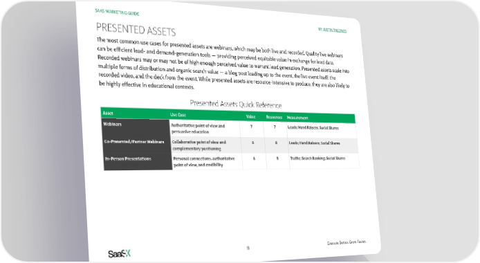 SAAS MARKETING GUIDE BY: JUSTIN TALERICO PRESENTED ASSETS The most common use cases for presented assets are webinars, which may be both live and recorded. Quality live webinars can be efficient lead- and demand-generation tools — providing perceived equitable value in exchange for lead data. Recorded webinars may or may not be of high enough perceived value to warrant lead generation. Presented assets scale into multiple forms of distribution and organic search value — a blog post leading up to the event, the live event itself, the recorded video, and the deck from the event. While presented assets are resource-intensive to produce, they are also likely to be highly effective in educational contexts. Presented Assets Quick Reference Asset Use Case Value Resources Measurement Webinars Authoritative point of view and 7 7 Leads; Hand Raisers; Social Shares persuasive education Co-Presented/Partner Webinars Collaborative point of view and 8 8 Leads; Hand Raisers; Social Shares complementary positioning In-Person Presentations Personal connections, authoritative 8 9 Traffic; Search Ranking; Social Shares point of view, and credibility 19 Execute Better. Grow Faster.