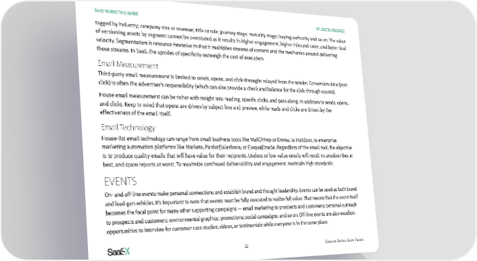 SAAS MARKETING GUIDE BY: JUSTIN TALERICO tagged by industry; company size or revenue; title or role; journey stage; maturity stage; buying authority and so on. The value of versioning assets by segment cannot be overstated as it results in higher engagement; higher inbound rates; and faster deal velocity. Segmentation is resource intensive in that it multiplies streams of content and the mechanics around delivering those streams. In SaaS, the upsides of specificity outweigh the cost of execution. Email Measurement Third-party email measurement is limited to sends, opens, and click-throughs relayed from the sender. Conversion data (post click) is often the advertiser’s responsibility (which can also provide a check and balance for the click-through counts). House email measurement can be richer with insight into reading, specific clicks, and pass along, in addition to sends, opens, and clicks. Keep in mind that opens are driven by subject line and preview, while reads and clicks are driven by the effectiveness of the email itself. Email Technology House-list email technology can range from small business tools like MailChimp or Emma, to HubSpot, to enterprise marketing automation platforms like Marketo, Pardot|Salesforce, or Eloqua|Oracle. Regardless of the email tool, the objective is to produce quality emails that will have value for their recipients. Useless or low-value emails will result in unsubscribes at best, and spam reports at worst. To maximize continued deliverability and engagement, maintain high standards. EVENTS On- and off-line events make personal connections and establish brand and thought leadership. Events can be used as both brand and lead-gen vehicles. It’s important to note that events must be fully executed to realize full value. That means that the event itself becomes the focal point for many other supporting campaigns — email marketing to prospects and customers; personal outreach to prospects and customers; environmental graphics; promotions; social campaigns; and so on. Off-line events are also excellent opportunities to interview for customer case studies, videos, or testimonials while everyone is in the same place. 22 Execute Better. Grow Faster.