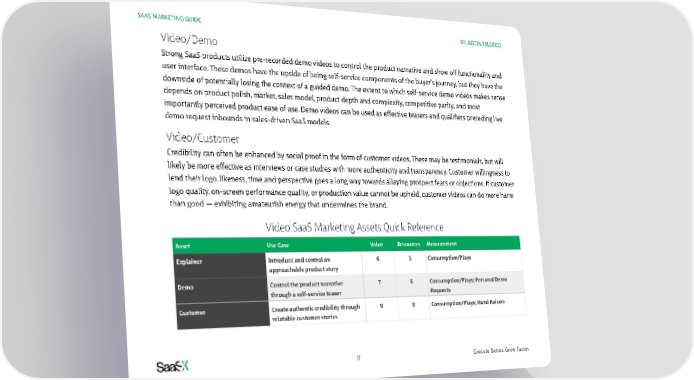 SAAS MARKETING GUIDE BY: JUSTIN TALERICO Video/Demo Strong SaaS products utilize pre-recorded demo videos to control the product narrative and show off functionality and user interface. These demos have the upside of being self-service components of the buyer’s journey, but they have the downside of potentially losing the context of a guided demo. The extent to which self-service demo videos makes sense depends on product polish, market, sales model, product depth and complexity, competitive parity, and most importantly perceived product ease of use. Demo videos can be used as effective teasers and qualifiers preceding live demo request inbounds in sales-driven SaaS models. Video/Customer Credibility can often be enhanced by social proof in the form of customer videos. These may be testimonials, but will likely be more effective as interviews or case studies with more authenticity and transparency. Customer willingness to lend their logo, likeness, time and perspective goes a long way towards allaying prospect fears or objections. If customer logo quality, on-screen performance quality, or production value cannot be upheld, customer videos can do more harm than good — exhibiting amateurish energy that undermines the brand. Video SaaS Marketing Assets Quick Reference Asset Use Case Value Resources Measurement Explainer Introduce and control an 6 3 Consumption/Plays approachable product story Demo Control the product narrative 7 8 Consumption/Plays; Personal Demo through a self-service teaser Requests Customer Create authentic credibility through 9 9 Consumption/Plays; Hand Raisers relatable customer stories 17 Execute Better. Grow Faster.