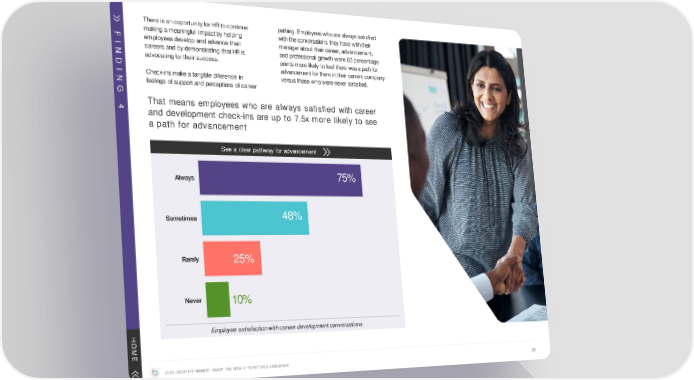 Thereisan opportunityfor HR tocontinue pathing. Employeeswhoare alwayssatisfied making ameaningful impactbyhelping with theconversations they have withtheir F employeesdevelop andadvance their managerabout their career,advancement, I careers and bydemonstrating thatHR is and professional growth were 65 percentage N advocatingfor their success. points morelikely tofeel there wasapath for D advancement for them in their current company I Check-insmakeatangible diference in versusthose whowerenever satisfied. N feelings of support and perceptions of career G That means employees who are always satisfied with career 4 and development check-ins are up to 7.5x more likely to see a path for advancement See a clear pathway for advancement Always 75% Sometimes 48% Rarely 25% Never 10% H Employee satisfactionwithcareerdevelopmentconversations O M E 2023 Global HR Research Report: The State of Performance Enablement 29