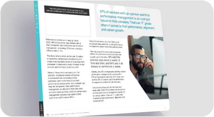 Hastheperformance review process in your 37%ofworkerswithanopinionsaidthat F companyundergone afundamental shift since2020? performancemanagementis an outright I N failure in their company.That’san “F” grade D I whenitcomestotheirperformance,alignment, N G andcareergrowth. 1 Performance reviews are changing. Since Despitethesetrends, only 1in3 (32%)of all 2020,46%of our survey respondents toldus employeestodaysaidtheircurrentperformance their companies haveadded new performance management system helpsthemperform better. management technology(17%),new processes (18%),or both (11%). Thismayaccountforwhysofew employees believe the performancereview processwas This likely reflects eforts on the part of leaders agooduseof theirtime:19% said the to streamline performancedevelopment and process was never a waste of createmoreequitable review anddevelopment timeandefort,and 64% seeitas processes in response tomajor changes in how always or sometimes a waste. weworkandtheongoing talentcrunch. Someof theseeforts are paying of. For Similarly, only 46% of employees said they believe example, employeeswhosecompanies performance managementisasuccess.But implementednew technologyand/or 27%of respondentssaid they didn’t know, and processes were morelikelytosee their another 27%of workers said that performance performancereviewsas fair and unbiased, say managementisafailure in their company. they felt recognized, view performance management as relevant totheir dailywork, If weremovethosewhodonotknow and andweretwiceas likelytofeel theperformance recalculate, that’s 37% of those withan opinion management processwasuseful totheir on their performancemanagement saying it is performance(61%versus 28%). an outrightfailure. That’s an “F” grade when it comes totheir performance, alignment, and H career growth. O M E 2023 Global HR Research Report: The State of Performance Enablement 15