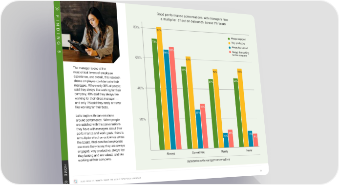 Good performance conversations with managers have a multiplier effect on outcomes across the board F IN 80% 81% D Always engaged I Very productive N 73% Always feel valued G 68% Always like working 66% for thecompany 5 60% 62% Themanager isone of the 55% 54% 55% mostcritical levers of employee experience, and overall, this research 47% 48% shows employee confidencein their managers. Whereonly39% of people 40% saidtheyalways likeworking for their company,48%saidtheyalways like workingfor their direct manager — andonly11%saidtheyrarely or never like working for their boss. 30% Let’s begin withconversations 26% around performance. Whenpeople 20% are satisfied withtheconversations theyhavewithmanagers about their performanceandworkgoals, thereis 12% amultiplierefect on outcomesacross 10% 11% theboard.Well-coachedemployees 9% aremorelikelytosaytheyarealways engaged,veryproductive,always feel they belong andare valued, and like Always Sometimes Rarely Never workingat theircompany. HO Satisfaction withmanager conversations M E 2023 Global HR Research Report: The State of Performance Enablement 32