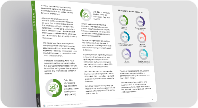 In Finding4, wesaw how important career Managers wantmoresupport in... conversations are tomaking employees feel Only 24% of managers F supported andable tosee acritical pathway say they always get IN for internal advancement. the support they need 41% from HR 40% D Alargegroupof employeesremains IN unsatisfied withthesupporttheir managers Managerswantbettersupport from their Coaching Reviews, assessments, are giving themfor careerand development. organizations. Their top priorities are more G This shouldbeared flagfor managers. Only guidance in coaching performance (41%);help performance andratings half (51%)said their manager is a help to them with reviews, assessments, and ratings (40%); 5 in their professional growth.Another33%said and assistancein helping employees develop their manager is neither a help nor a hindrance, skills and path careers (38%). 38% 34% and 16%considered them an outright barrier to their careers. Managers are highlyreceptive toreceiving This maybe inpart becausemanagers are help and feedback.Infact, they were 15 Helpingemployeesdevelop Settingand percentagepointsmorelikelythan individual skills andpathcareers trackinggoals simplynot confident inhavingconversations contributorstosay they wantmorefeedback about careers withtheir directreports.Many on their work. supervisors —especially new managers —said they feel ill-equipped for conversations about Supportingmanagers isparticularly important 34% 32% career andadvancement. in thecurrentclimatebecausetheywere Thecoaches wantcoaching. While 71% of significantly more likely than individual Giving Providingsupportand respondentssaidtheywereabletodeliver contributorstosay they were looking for or feedback empathy toemployees high-quality performancefeedback, only 54% open tochangingjobs inthenextyear (47% felt confident ofering career development and versus 34%of individualcontributors). coaching. Oneinten didn’tfeel confident in Likeindividual contributors, managersalso Tenureisan important part of thisstory. Employee either one. have low trust in their organization’s leaders satisfaction withmanager conversations on (31%)and HR (24%)—somethingthat should performanceandcareergrowthcorrelates withthe Only 54% beconcerning for their business partners in tenureof one’s manager. of managers those areas. feel confident Whilenew managers haveroughlythesame delivering career Only24%of managers felt they always get frequencyof check-ins withtheir reportson thesupporttheyneed frompartnersinhuman performanceandcareer, wesaw thatexperience development resources, while nearly a third (32%)said they level significantly impactedemployees’ satisfaction HO and coaching rarely or never do. withtheseconversations. M E 2023 Global HR Research Report: The State of Performance Enablement 34
